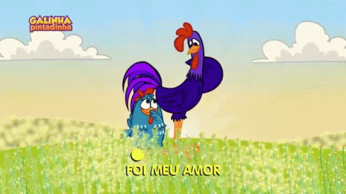 Galinha Pintadinha characters, a rooster and hen, in a field with the Portuguese caption 'Foi Meu Amor'.