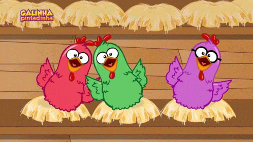Three colorful cartoon chickens from Galinha Pintadinha, including one with glasses, sitting on hay nests.
