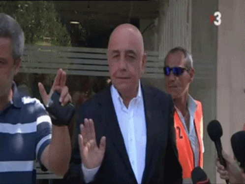Adriano Galliani greets the press and waves to reporters outside a building.