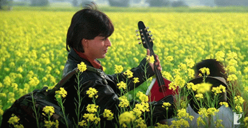 Shah Rukh Khan and Kajol Devgan share a romantic hug in a vibrant mustard field, an iconic DDLJ moment.