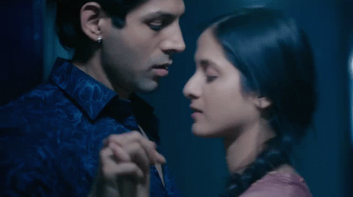 Raghu (Kartik Aaryan) and Leena (Aarushi Sharma) share an intimate hug in a dimly lit setting from Love Aaj Kal.