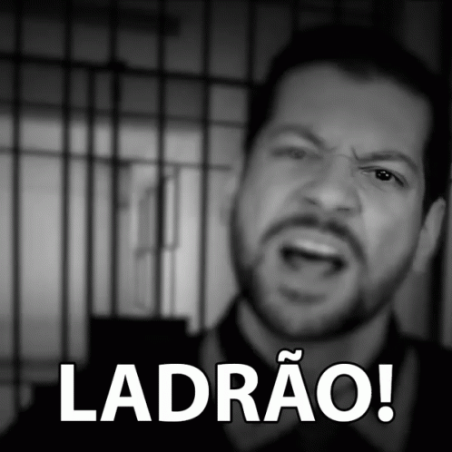 Man shouting 'Thief!' in a black and white scene, possibly from a Galo Frito humor sketch with prison bars.