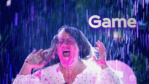 A contestant on Game of Games gets covered in pink slime during the 'Game Face On' challenge.