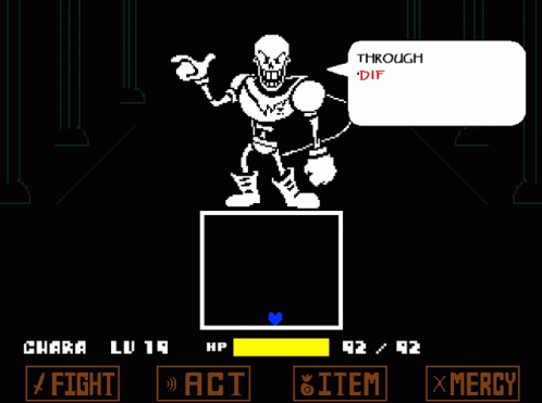 Papyrus from Undertale in a battle sequence, delivering dialogue about using 'different means' and asking for good luck.