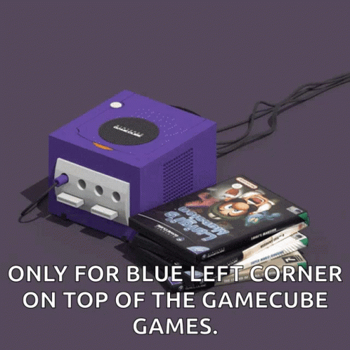 A purple GameCube console with a stack of games, featuring a disc being inserted.