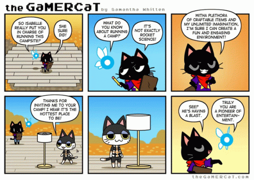 A comic by Samantha Whitten featuring Gamercat and another cat discussing running a campsite with craftable items.