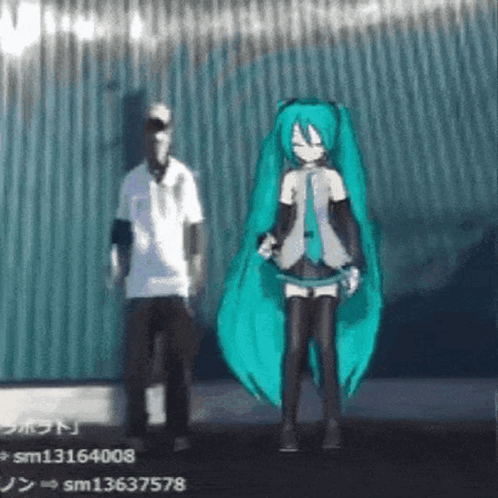 Hatsune Miku and a man performing the gangster dance together in a stylized setting.