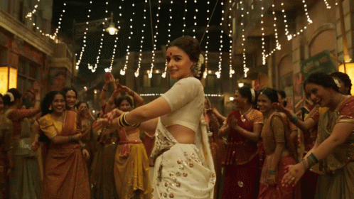 Alia Bhatt dances gracefully in a white saree amidst a festive street scene from Gangubai Kathiawadi.