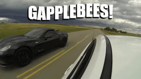A black Corvette ZR1 and another car race on a rural road, with 'Gapplebees!' text overlay.