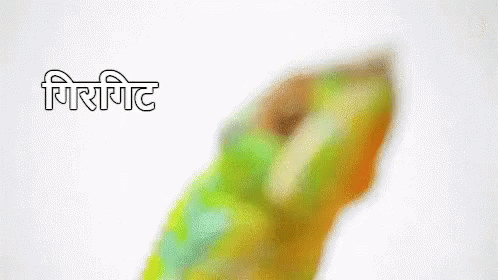 A vibrant chameleon with striking green, yellow, and orange scales, captured in a close-up against a clean white background.