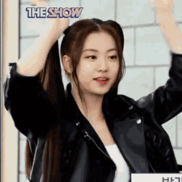Kim Garam of LE SSERAFIM makes peace signs during her debut interview.
