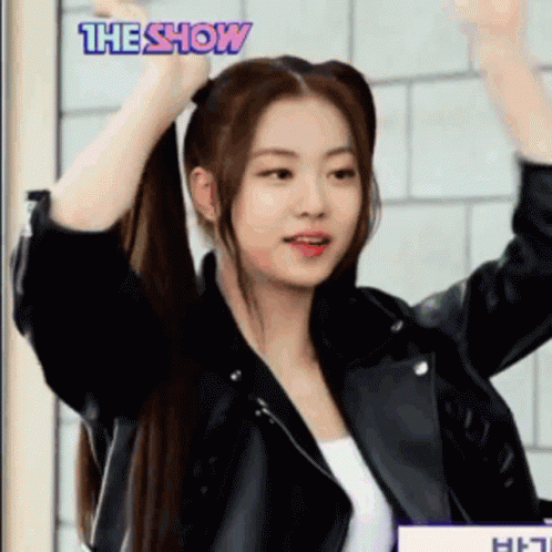 Kim Garam makes a cute pigtail pose while appearing on 'The Show', wearing a stylish leather jacket.