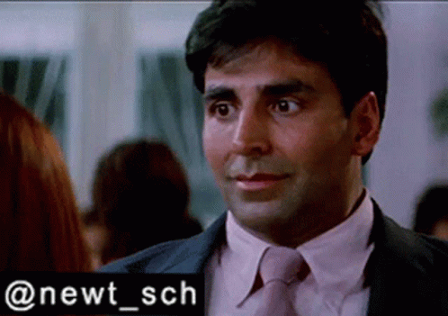 Akshay Kumar gives a funny, surprised reaction in a scene from the movie Garam Masala, wearing a suit and pink tie.