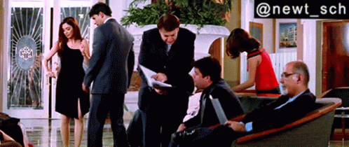 Akshay Kumar, Makrand, and Langda in a lively scene from the movie Garam Masala, with Akshay Kumar dancing in a lobby.