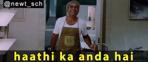 Paresh Rawal from Garam Masala delivers the iconic 'Haathi Ka Andaa Hai' dialogue in a kitchen scene.