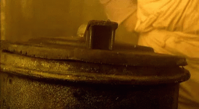 A dark garbage can with its lid ajar, hinting at something hidden inside, as suggested by 'Garbage Eyes'.