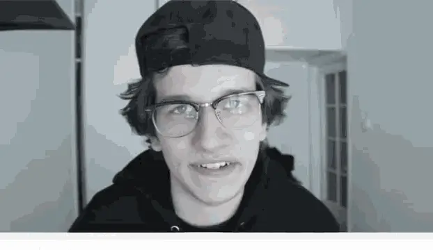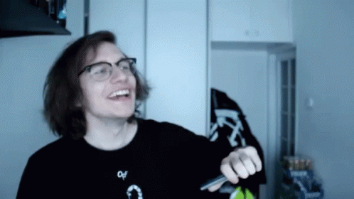 Gargamel, wearing glasses and a black shirt, laughs heartily in his vlog, with 'KOMEDIA' on screen.