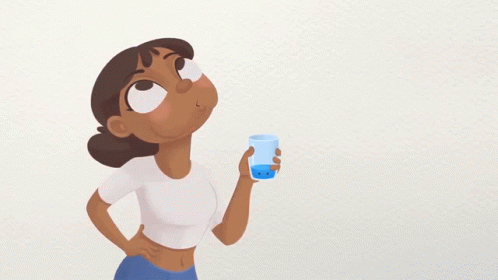 A cartoon girl holds a glass of water and gargles, looking up curiously.