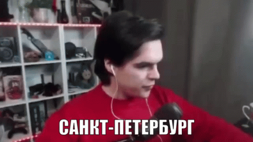 Garryuchis, wearing a red sweater and headphones, animatedly talks about Saint Petersburg.