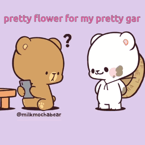 Garshith and Milkmocha Gar in a sweet moment: one bear offers a 'pretty flower' to the other, who is engrossed in a phone.