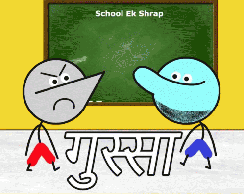 Two stick figures, one angry, stand before a blackboard reading 'School Ek Shrap' (School is a Curse).