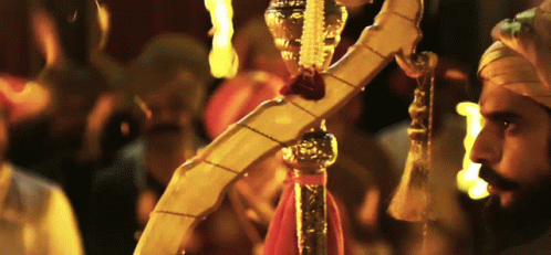 Gashmeer Mahajani in traditional attire, holding an ornate ceremonial staff, followed by a magnificent golden throne.