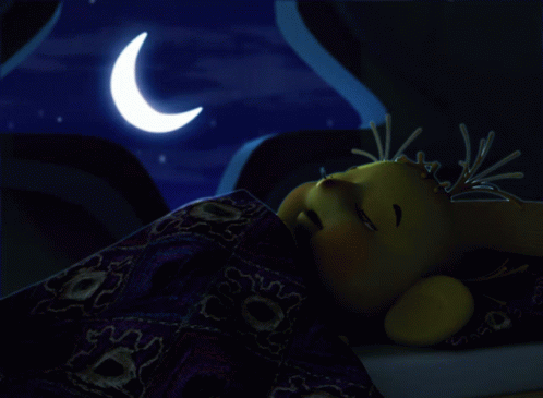 Gatenda, a cute yellow cartoon character, wakes up from sleep as the sun rises.