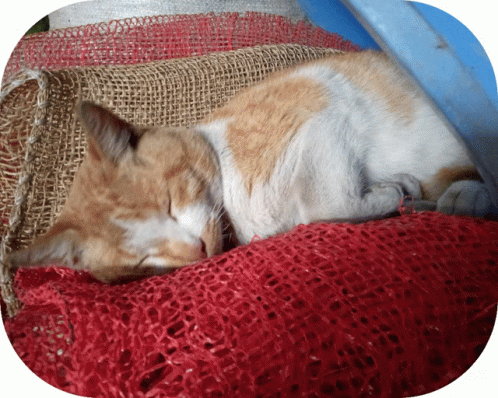 An adorable orange and white cat (gato) peacefully sleeping on a red blanket, showcasing a tender moment.