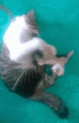 A cute tabby and white cat lies on its back in a teal basin, playfully batting a small toy.