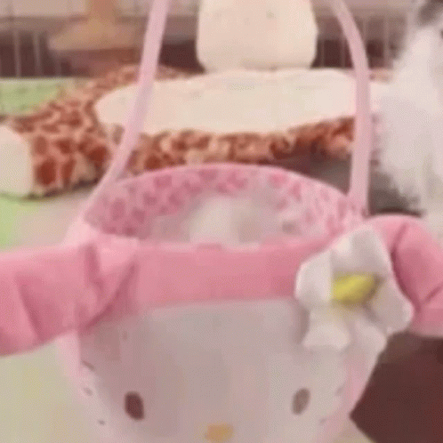 A fluffy white kitten peeks out from a pink Hello Kitty basket, looking around curiously.