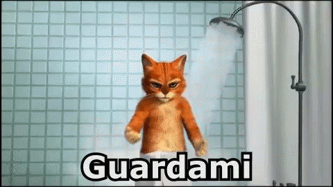 Puss in Boots takes a shower, making a charming face as the text "Guardami" (Look at me) appears.