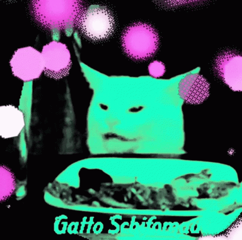 Alessio Steel's iconic Gatto Schifomadò meme featuring a color-changing cat and food, a viral internet sensation.
