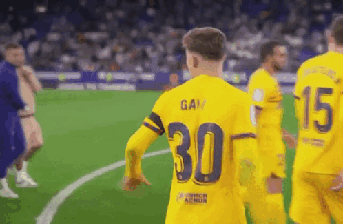 Gavi, wearing his number 30 FC Barcelona jersey, shares a warm embrace with teammate Frenkie De Jong on the soccer field.