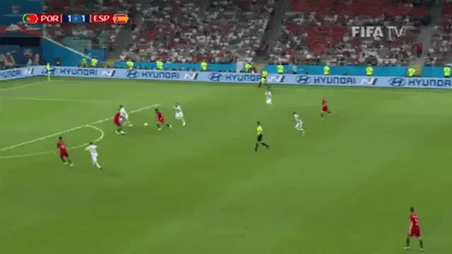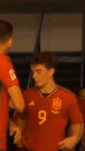 Spanish footballer Gavi is seen wearing his national team jersey, number 9, looking focused.