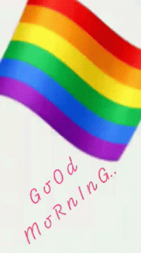 A vibrant gay rainbow flag waves gently, featuring a cheerful 'Good Morning..' message written below.