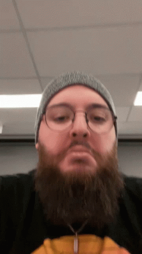 Gaz, a man with a beard, glasses, and beanie, makes expressive faces for the camera.
