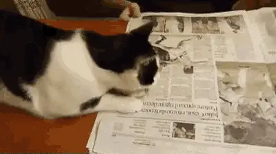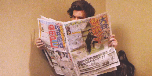 A young man with curly hair is engrossed in reading a large Japanese newspaper.