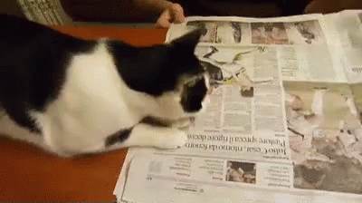 A black and white cat intently lying on and interacting with an Italian newspaper.