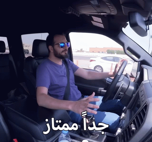 A man in sunglasses drives a modern car, with Arabic text "جداً ممتاز" (Very excellent) overlaid, indicating a positive driving experience.