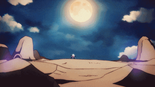 a cartoon drawing of a person standing in a desert with a full moon in the background