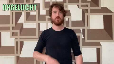 Man demonstrates the sign for "relieved" in Dutch Sign Language (NGT) in front of a geometric wall.
