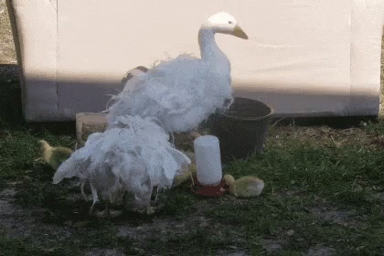 A large white goose flaps its wings, appearing to dance, next to a smaller goose and goslings on a farm.
