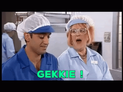 Kathy Burke as Krien says 'Gekkie!' to a colleague in a factory setting, wearing a uniform and hairnet.