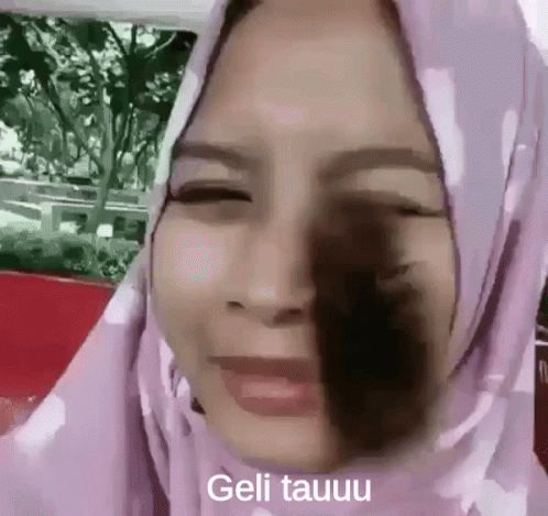 Woman in hijab reacts to a furry caterpillar on her face, exclaiming 'Geli tauuu' (It's ticklish).