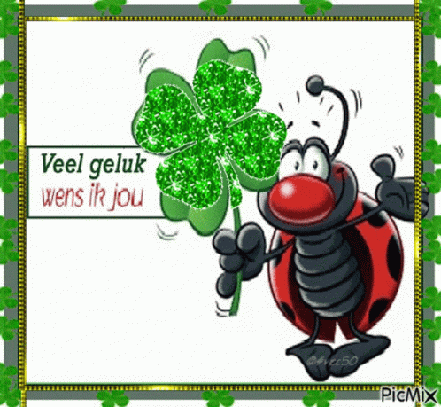 A cheerful cartoon ladybug holds a sparkling four-leaf clover, wishing 'Much luck I wish you'.