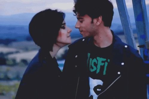 Gemavadillo and Cydonian Vlogger share a passionate kiss. A man in a Misfits shirt kisses a woman.