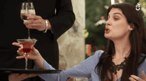 Luchita Rivera and Paloma Moreno react, holding drinks at a social gathering.