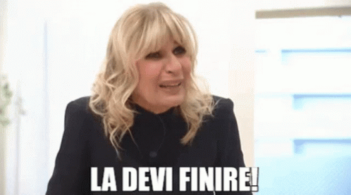 Gemma, a woman with blonde hair, makes a funny face while exclaiming 'La Devi Finire!' (You Have To Stop It!).