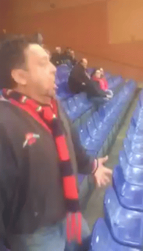 A passionate Genoa football fan, wearing a red and black scarf, yells intensely from the stadium stands.