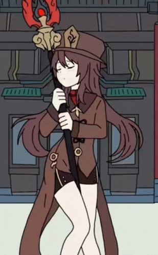 Animated Hu Tao from Genshin Impact stands with her iconic Staff of Homa in front of a traditional building.